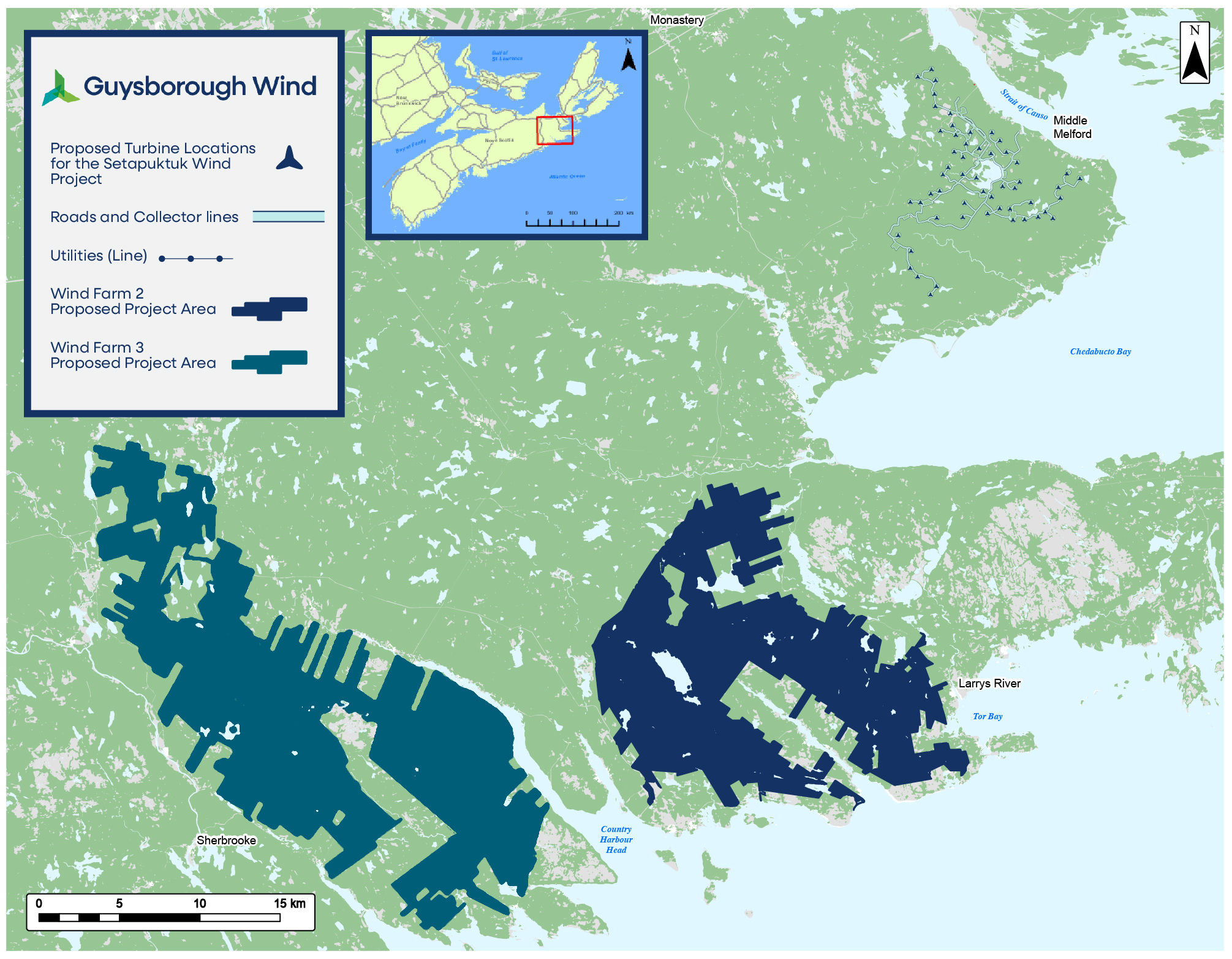 The projects include three new large-scale wind farms: Setapuktuk Wind Project (formerly Wind Farm 1), Wind Farm 2, and Wind Farm 3. Setapuktuk (Set-Tuh-Puck-Took) is the Mi’kmaq word for ‘Guysborough’.